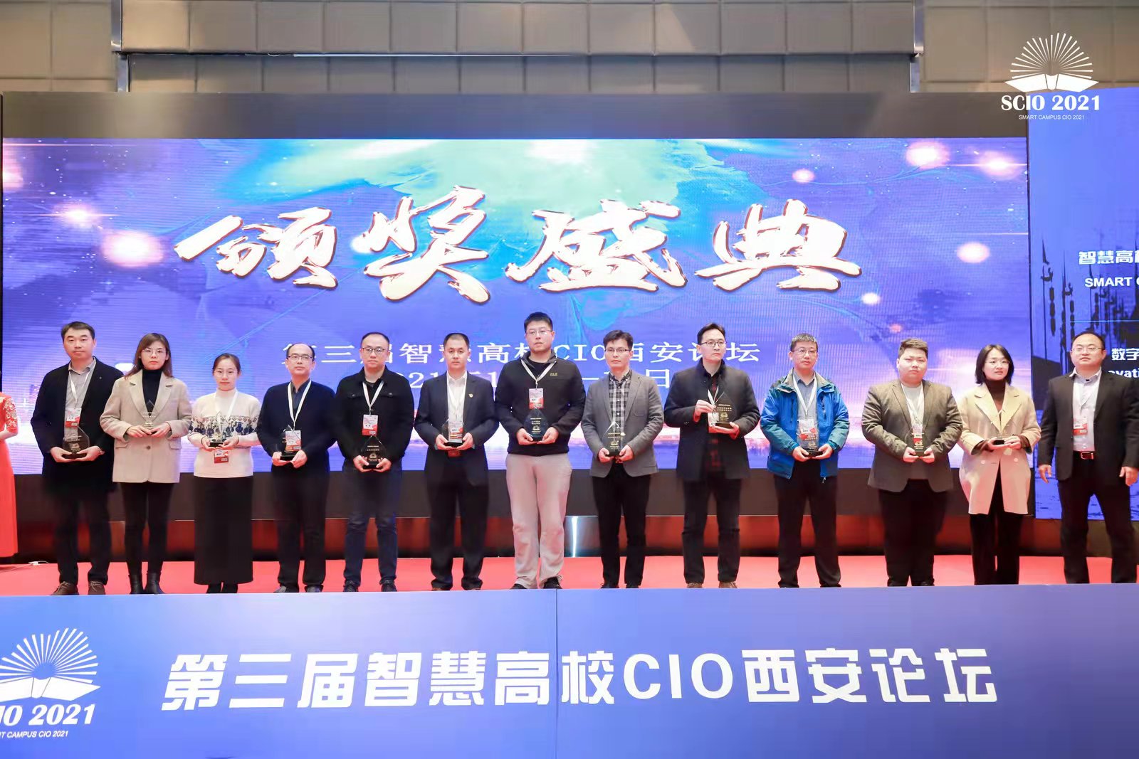 本站讯 12月9日—10日,“第三届智慧高校CIO西安论坛SCIO 2021”会议在西安举行。会议以“数字转型,以人为本”为主题,来自全国高校的信息化部门负责人400余人参加了本次会议。会议现场进行了第三届“凌云奖”颁奖典礼,我校荣获“智慧校园-特色高校”称号并受到会议表彰。